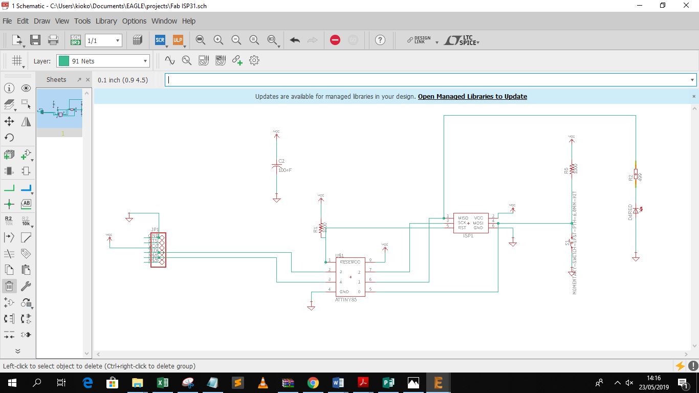 The first step was to check out the pinout for the ATtiny 85 which was the chip i was going to use for the hello world board. After understanding its pins I then went about to design the actual board.