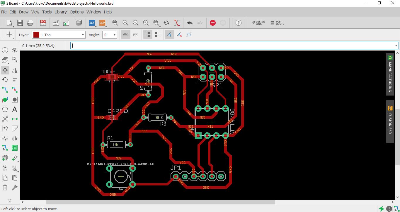 This weeks assignment was to redraw the echo hello-world board, add (at least) a button and LED (with current-limiting resistor) check the design rules, make it, and test it we have Two main assignments: