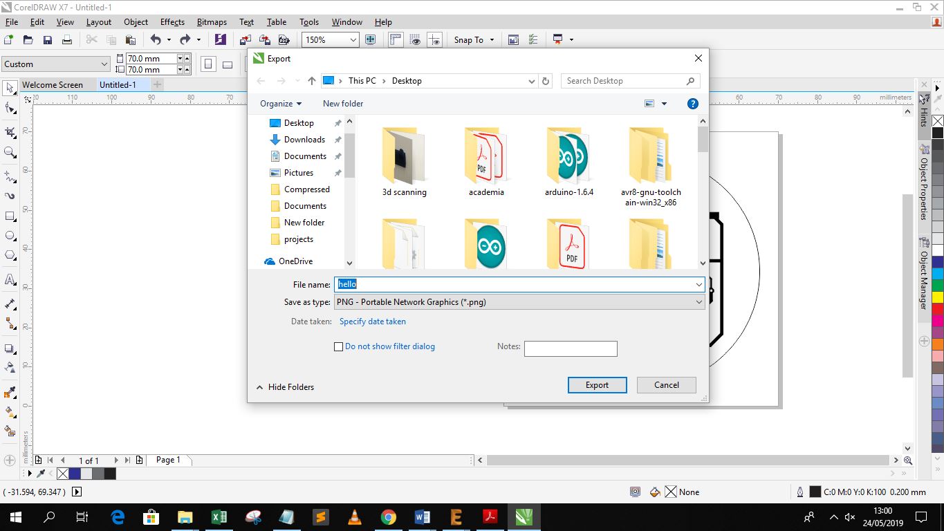 Since achieving the correct scale for the board when importing using png in eagle is hard, I selected the print to pdf command and printed the circuit with the layers required turned on. I then imported the PDF to corel draw and exported the png to accurate dimensions.