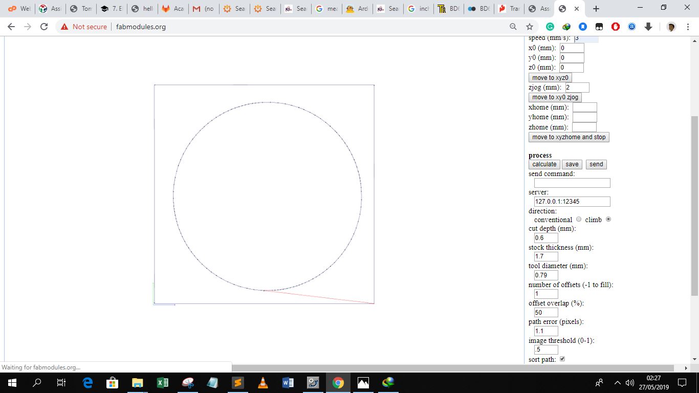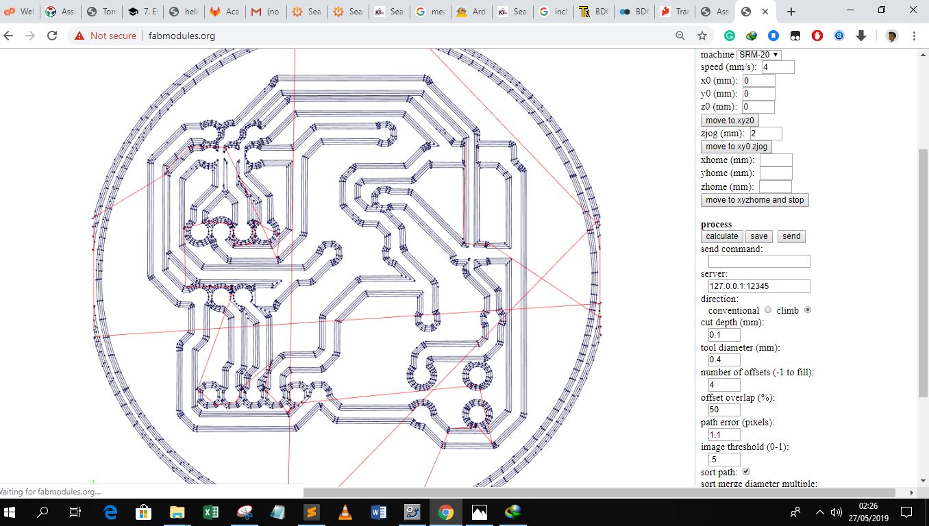 The next step involved generating the cam files using the fab modules, the first png upload was for the tracts and the other for the outline of the board.