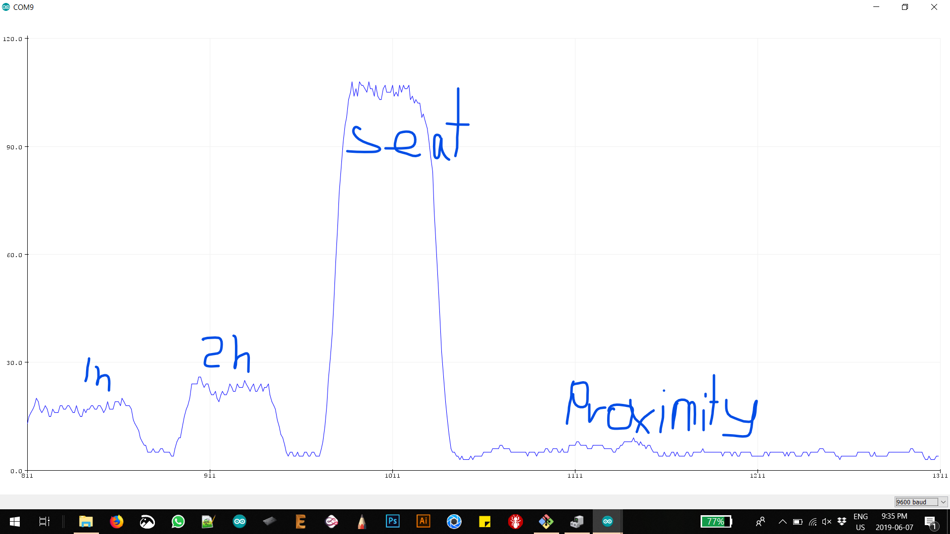 One of the closer measurement in the capacitive sensing that lead to the chair having proper sensibilites. The following shows the capcity with 1 hand, 2 hands, sat down and proximity, when somebody walks arround the chair creating that noise.
