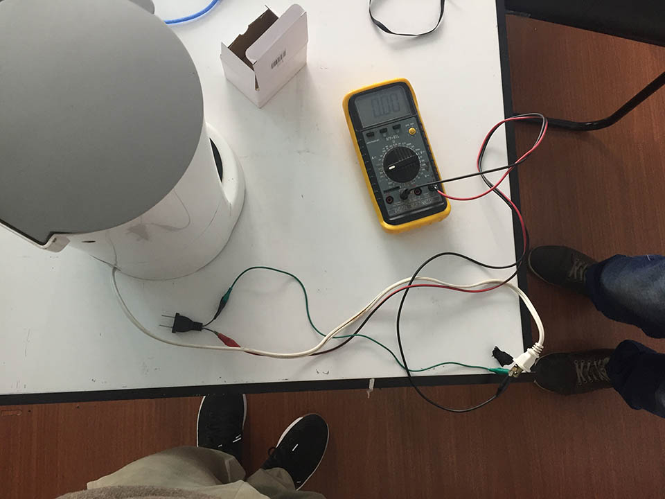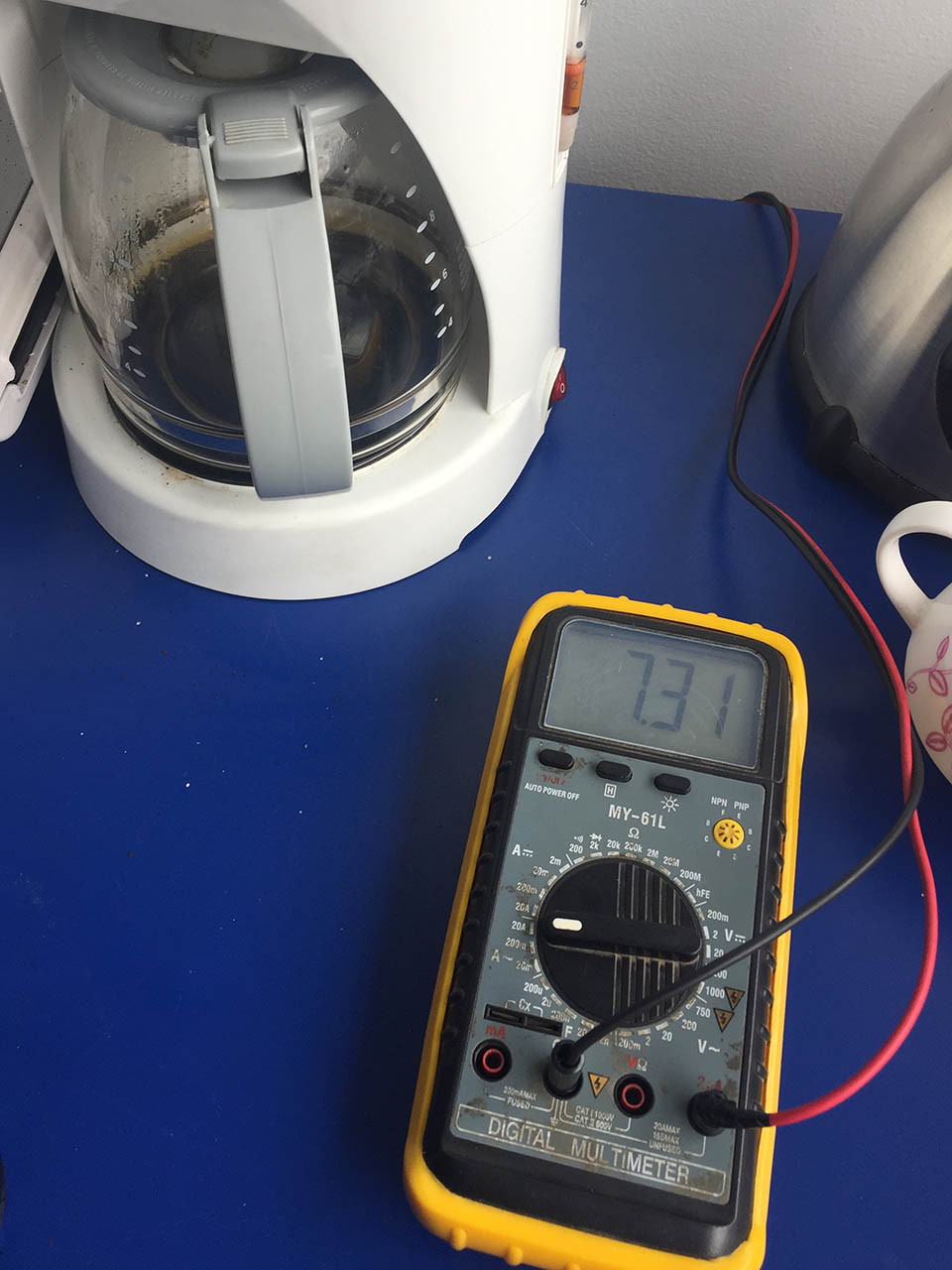 I measured the current going through an outlet into the Coffee Maker. In order for it to give a proper value of the resistance, I added water and actually brewed coffee.. for learning purposes of course.