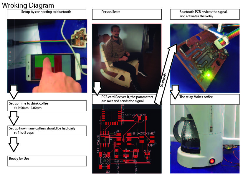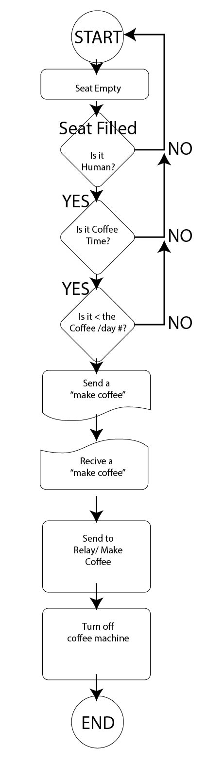 - I will design the electronics behind both (The chair and coffee system) systems, and the chair. Currently I have a rocking chair that is operational and being finished. If time permits I would like to create another chair, But the main tasks will be to connect the chair with the coffe machine.