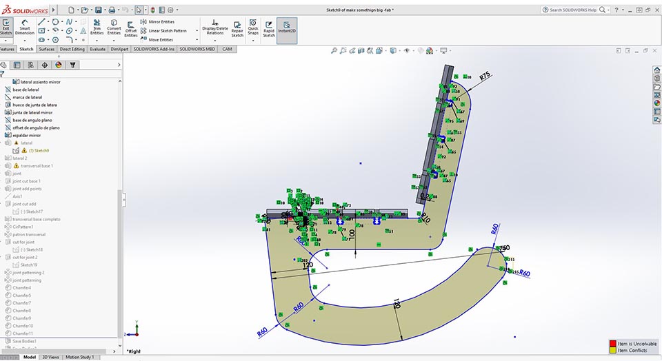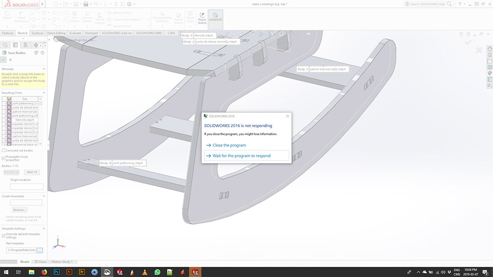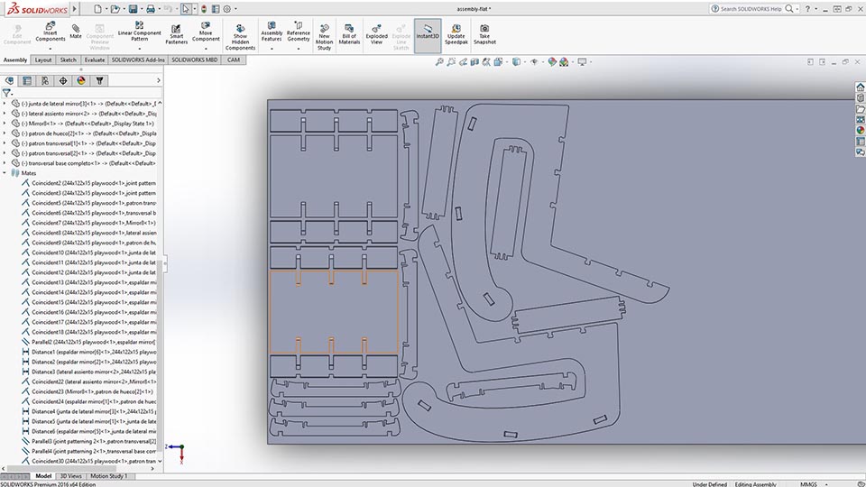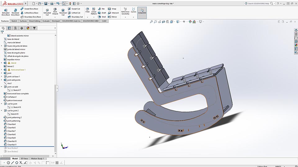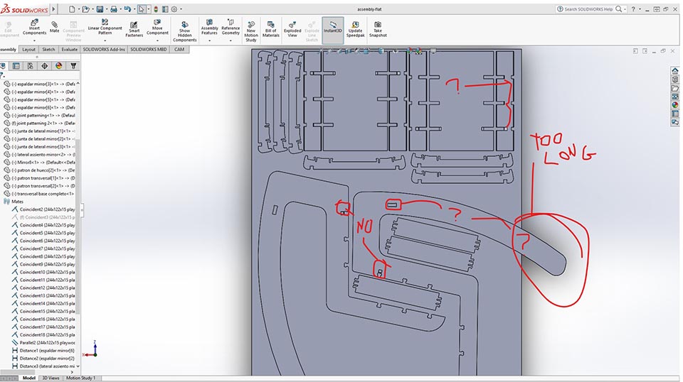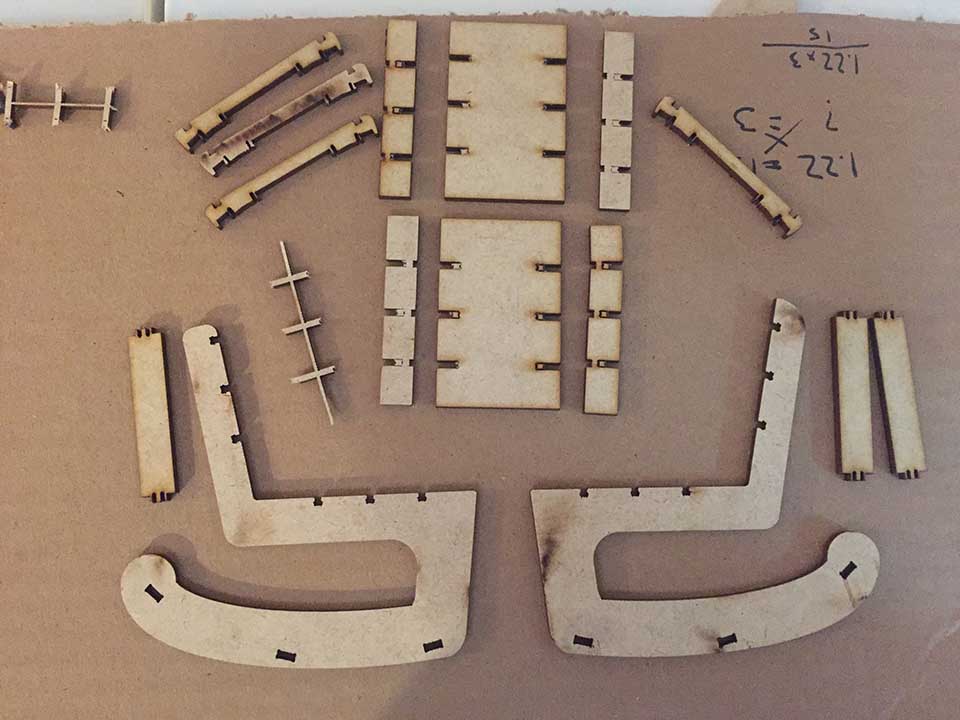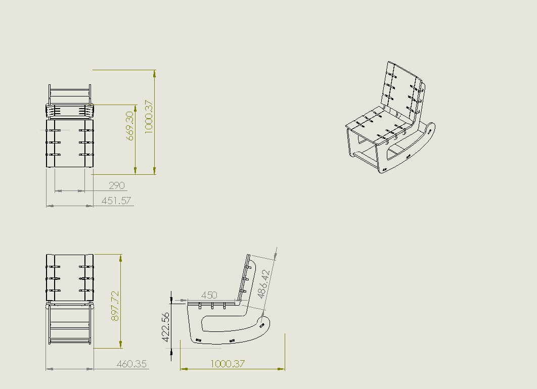 After the 1st setup of the material on top of the sheet, It was my thinking that too much material became wasted for a longer rocking motion. Aside the joint females from the lateral chair parts became assembled upside down (not showing the relif for the sanp fit to rest on). Aside the panels from the back rest and bottom did not have all the snapfit releif either.