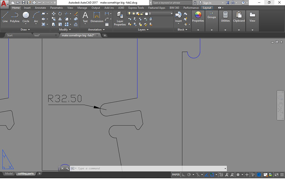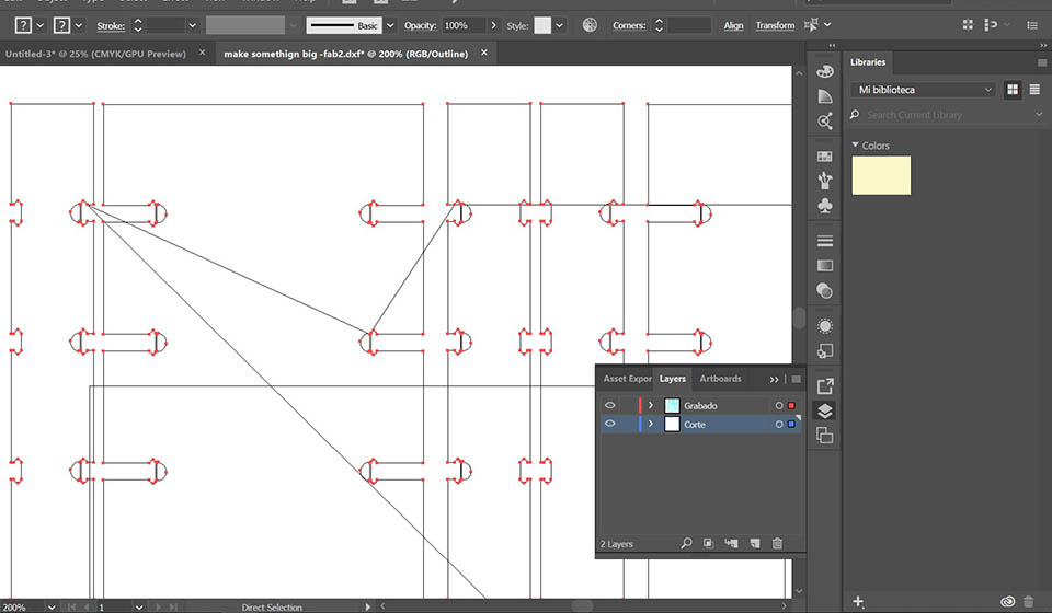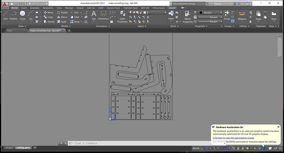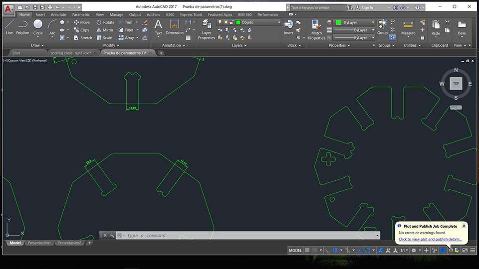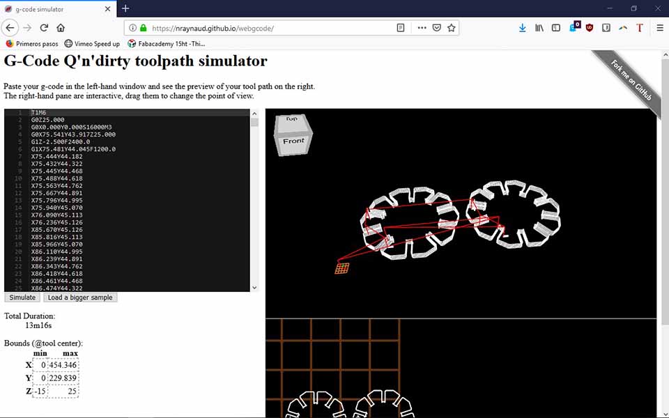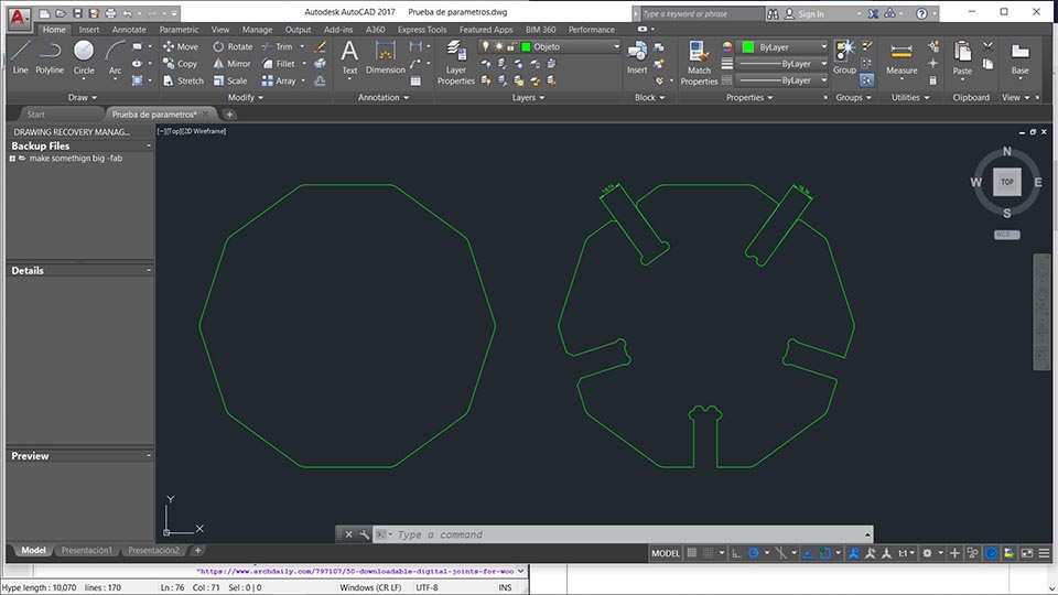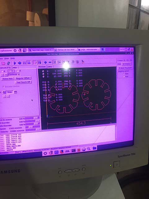 In our case we will be using the machine CNC Roter 1325. A test file borrowed from Alex > and Guillermo Before that. Keeping with the local fab's tradition. An exagonal shaped cut part containing variable cutting methods for assembly.