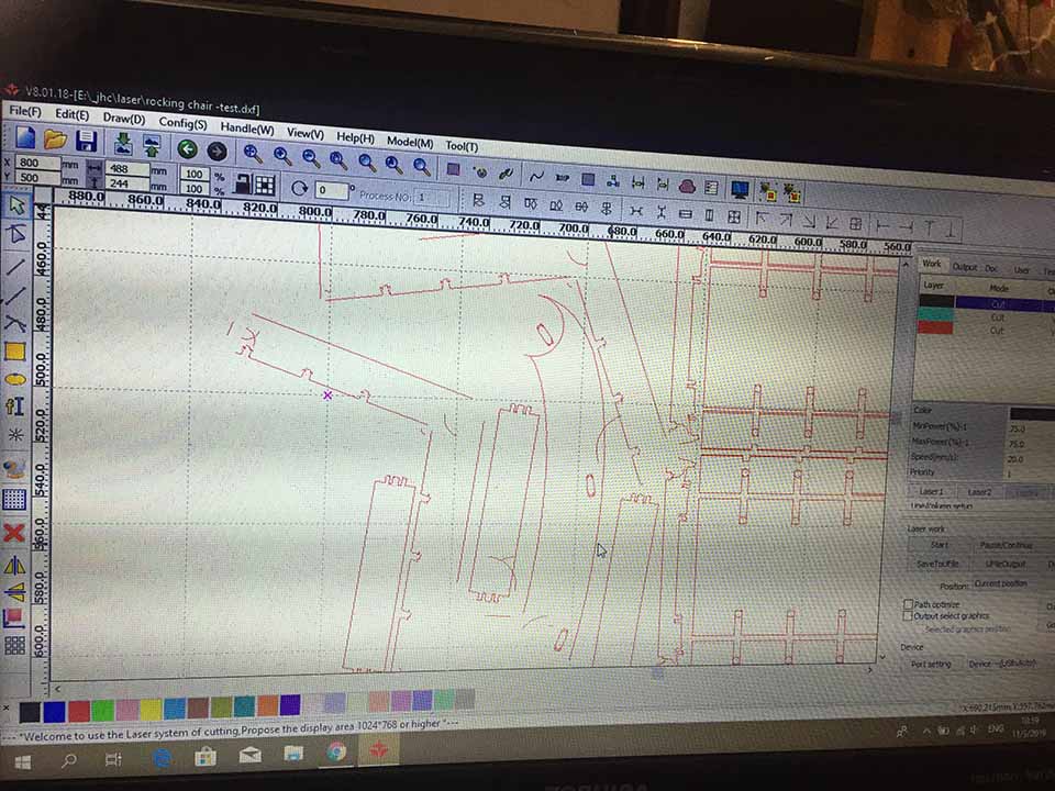 Here we see the rocking chair with the rocking base shortened from 1000mm to about 760mm. Resulting in a higher efficiency cut.
