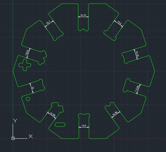 In this case I modified the original file made by Gillermo and gave it much more smaller and partern even steps. Unfortunately we later realized the material was closer to 15.2 than 15mm (as the provided intended) So the material had a snug fit at 15.25 mm(the widest). I'll be using a joint clearance of 15.35 just so it sort of slides.. hopefully.