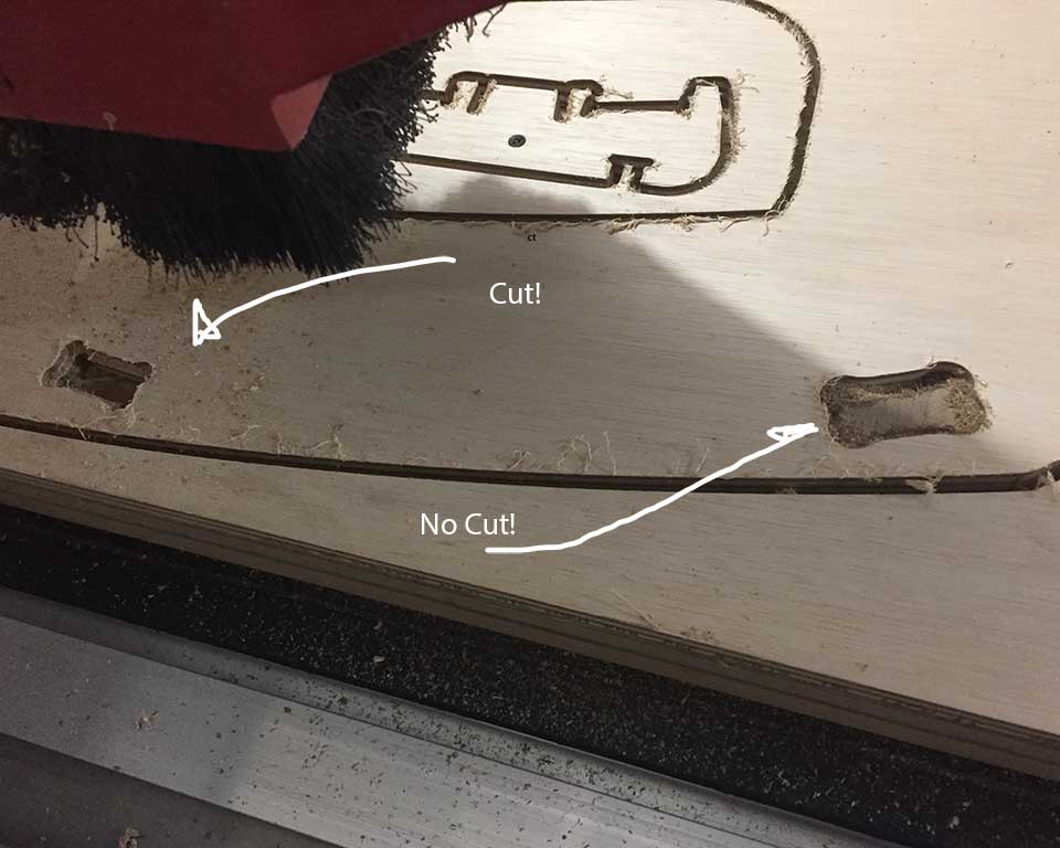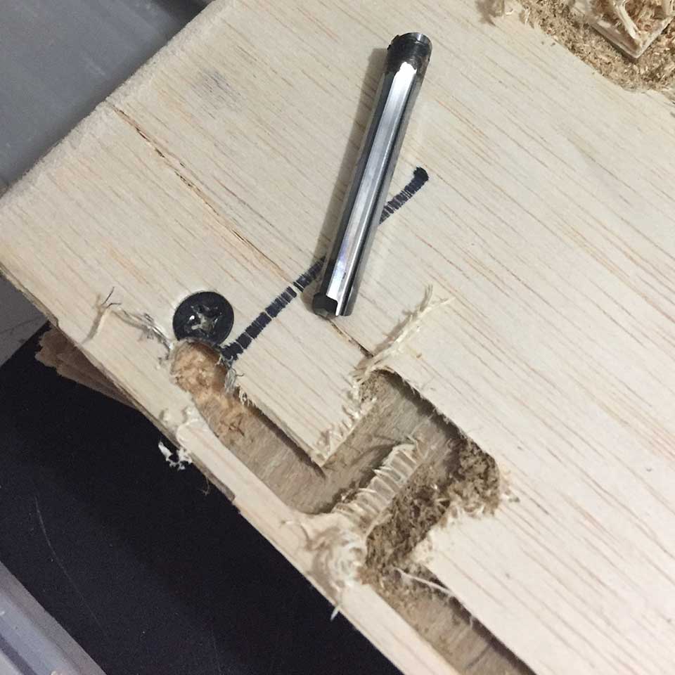I had a problem in the time of cutting, when the bit did touch a screw that was placed before the cnc's g code, in order to fix the ply wood in place.