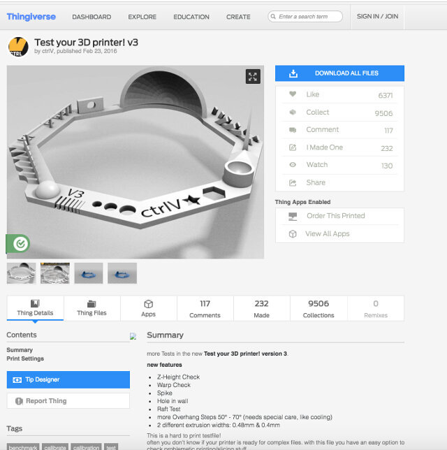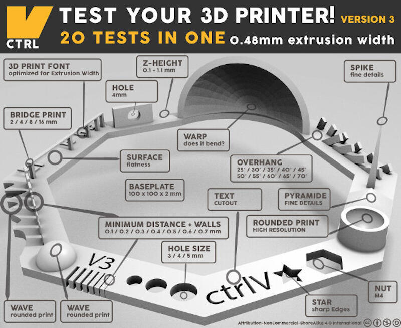 On the 3D printer test model's page, I downloaded the design and noted the parameters it tests, such as: