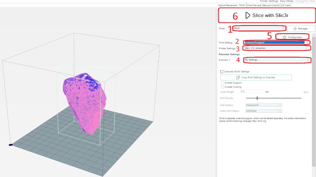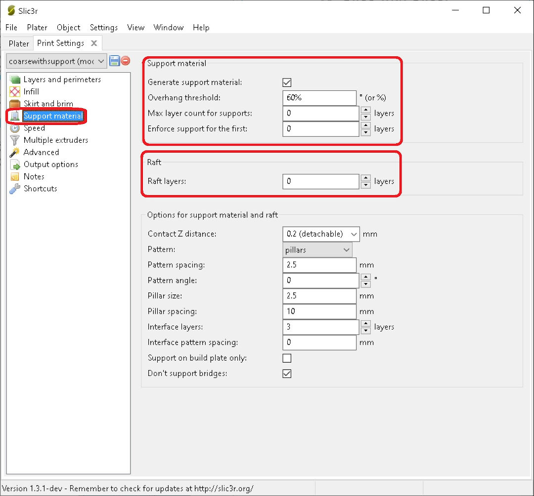 With Support material, you use this for overhangs. Support builds under your model in places where the negative slope is too steep, in order to prevent a real bird's nest by free-forming under your nose—I mean nozzle.