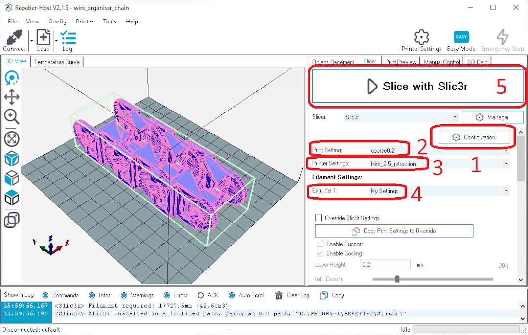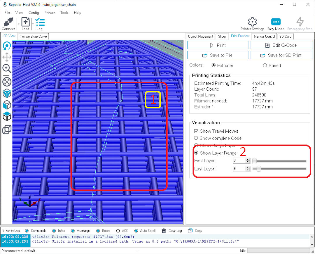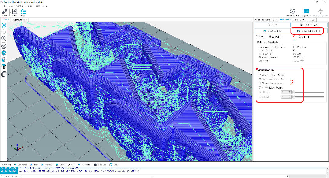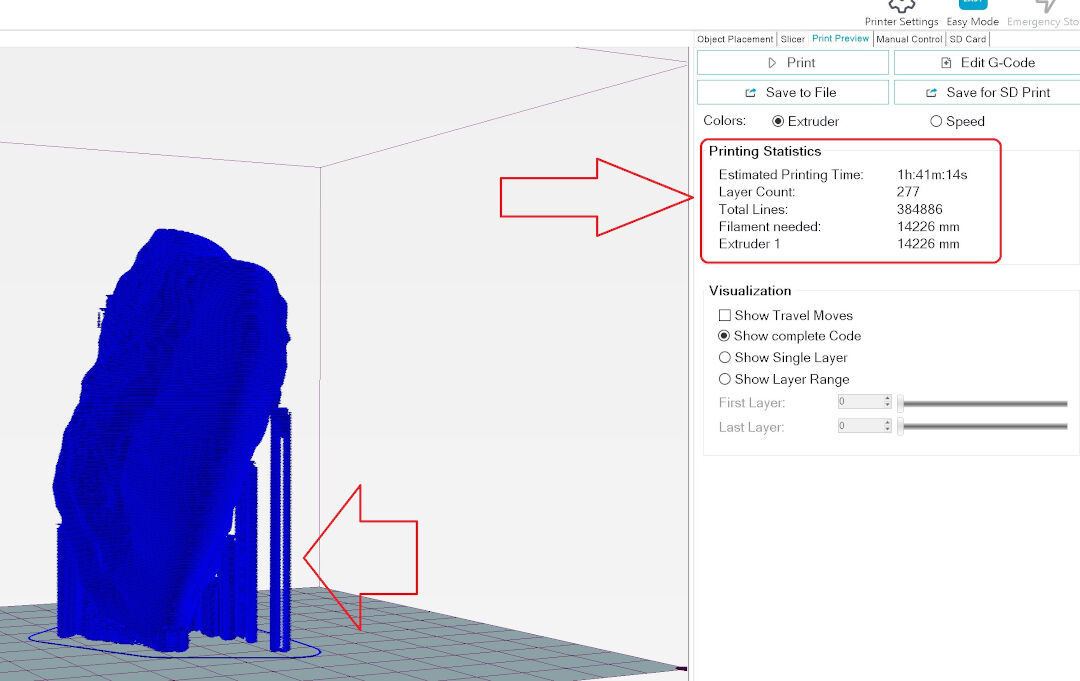 The G-code generated can be downloaded with the link above, but I extracted the beginning of it here in order to show a few of its statistics: