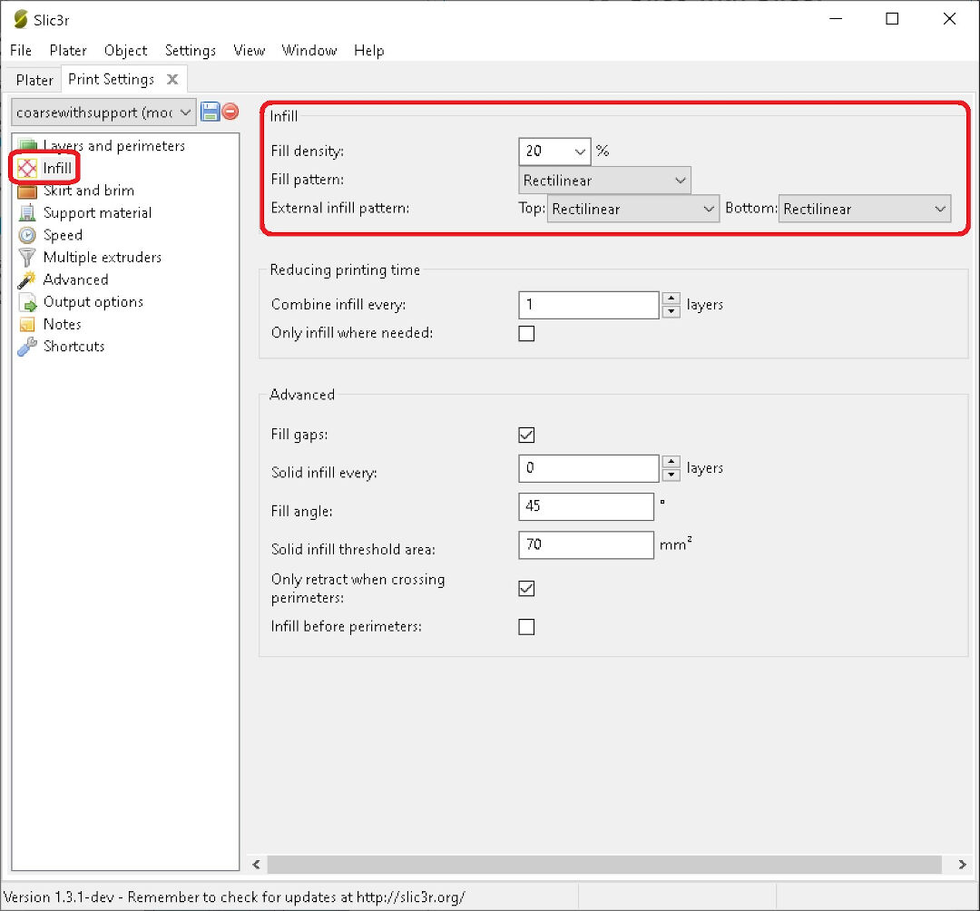 Now, this sub-class of the Print settings is infill. One can save a lot of time and money here. Someone once said they are both the same; frankly, I'd rather own the first than the second. The infill I have is 20%. I am not a cheapskate; I believe 20% is enough. After all, the ephemeral pieces this printer expels are rarely worth using all this corn. Ah, did I mention I am using PLA, a derivative of corn? Of course not; that's later in filaments... So, for now, believe me, 20% is enough for almost all prints. If you need to tow a truck, go crazy, use 100%. If, on the other hand, you want to make a delicate vase, 0% will leave you a hollow print.