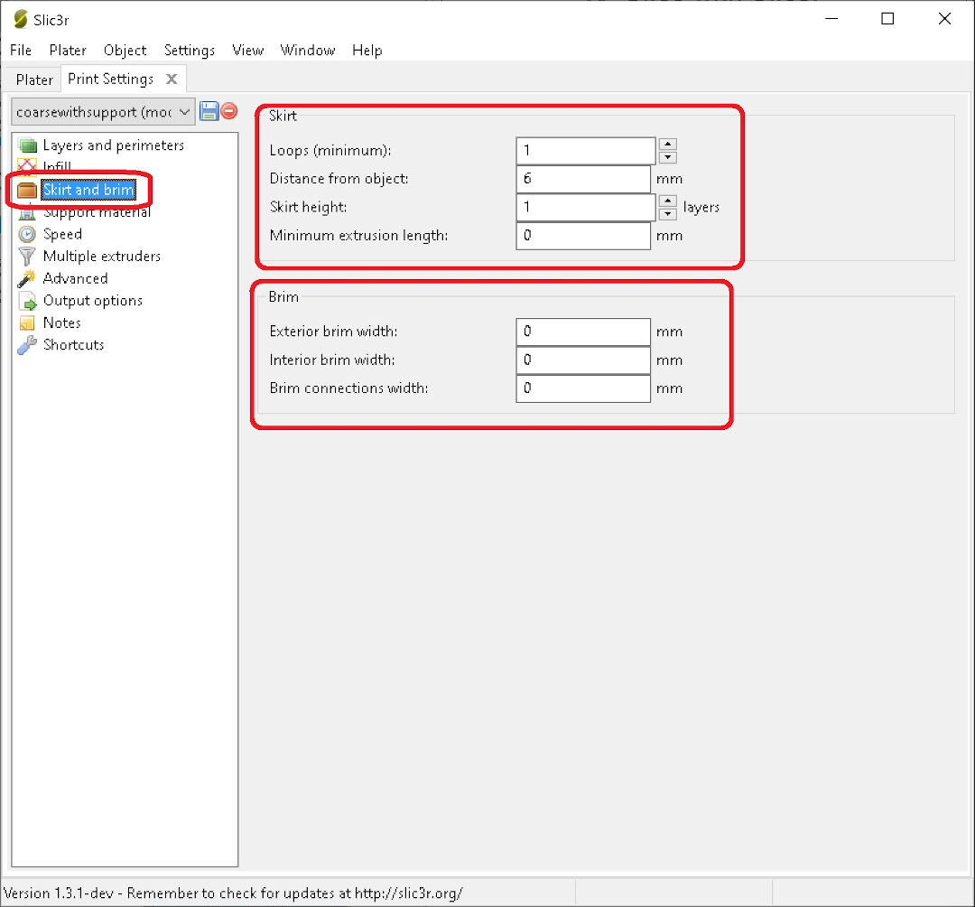In this subsection of Print settings, the famous Skirt and Brim, the savvy fabber can use Brim instead of the ridiculous and wasteful rafts done by those who won't take the time to level and calibrate their printers. By using a wide brim, you make sure your print won't detach from the bed. Brim basically consists of lines next to each other and attached to the print; it's great for a spiky model's base, or just corners that want to take off from the print bed, causing "warping". The skirt is used to kind of clean one's noose—I mean nozzle, yes, the printer nozzle, the part that the filament comes out of. This setting will extrude a line around the model to be printed, especially useful when filament promiscuity is the case, so when changing colors or filament types, be sure to either extrude in the air or add some skirt before your print.