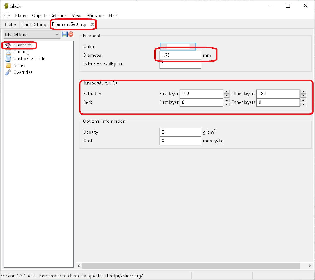 The class of filament settings deserves not much time as they are straightforward. If your filament supplier cares about you, they will give you the temperature at which to print on a label on the sides of the box or spool. The diameter is, and has always been with me, 1.75mm. The thinner diameter is easier to push than 3mm, the other standard in filament thickness. After all, we are pushing filament through a nozzle with a 0.4 mm diameter; that's thin, so choosing a printer that takes a thin filament is better!