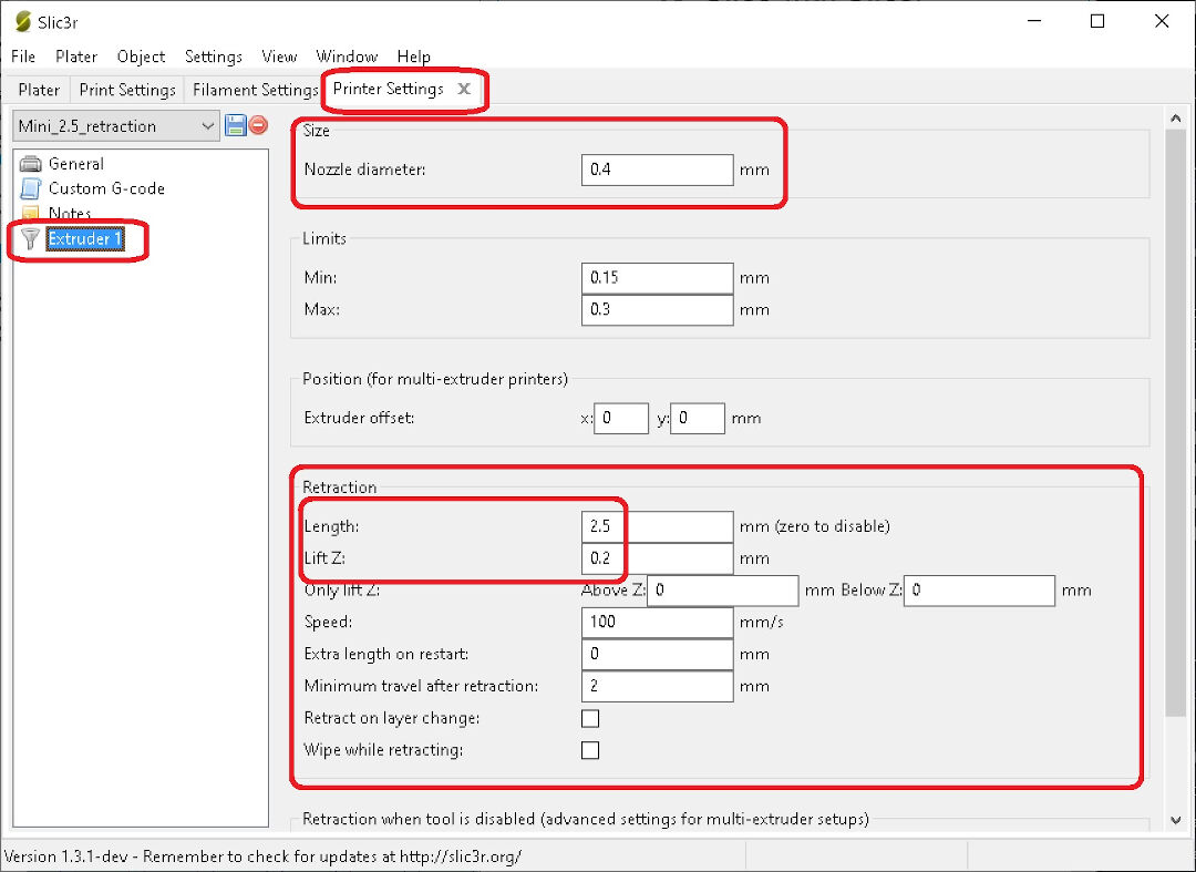 Here in printer settings, we find nozzle size. I use 0.4 mm. Next, my preferred setting in these tests—well, practically the only one I messed with—is "retraction".