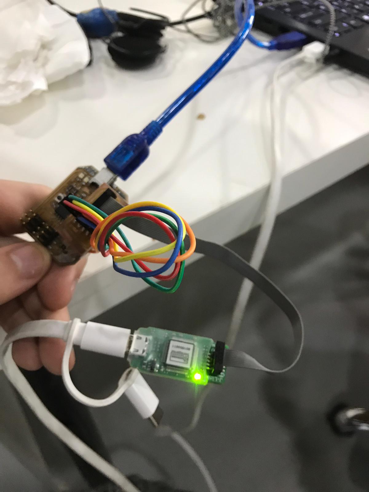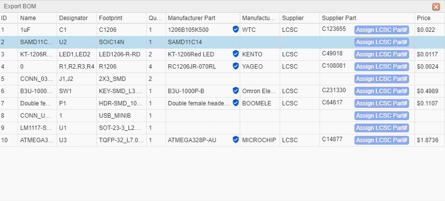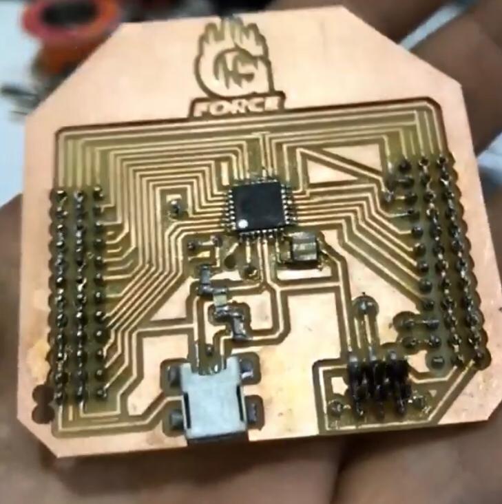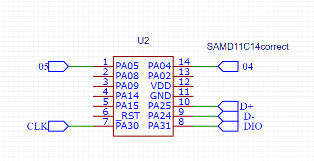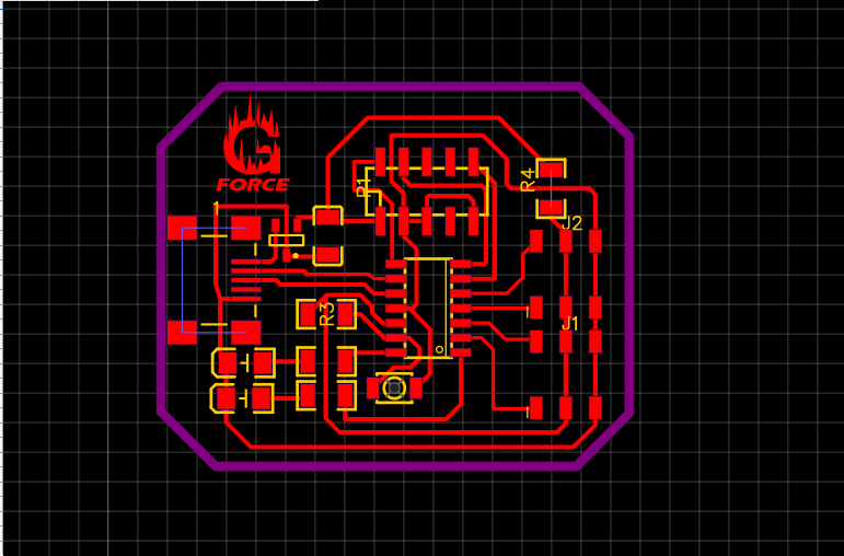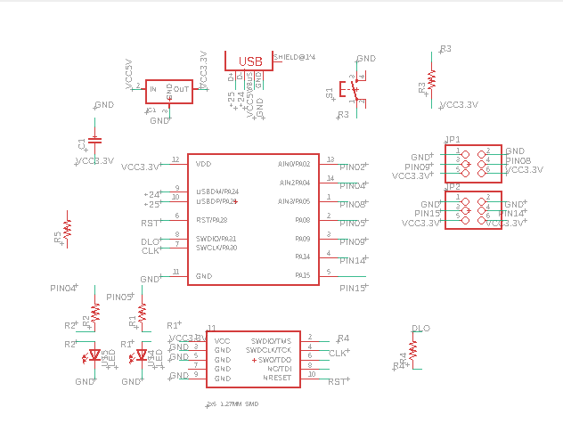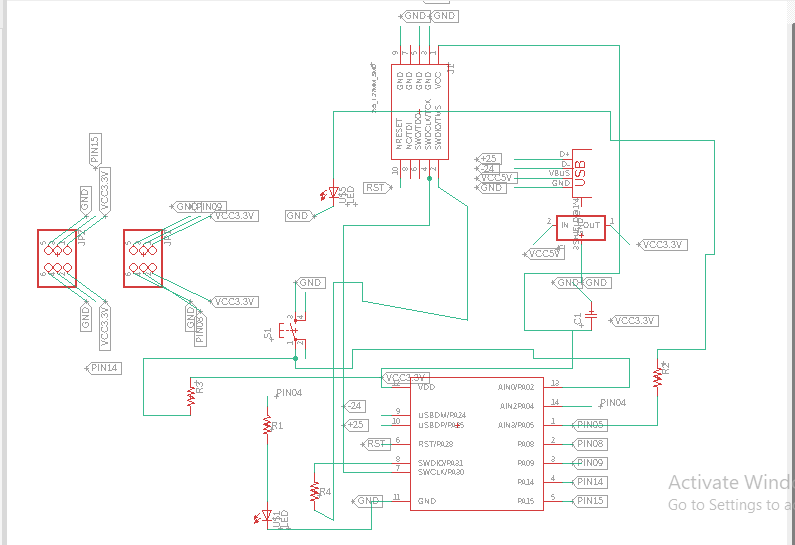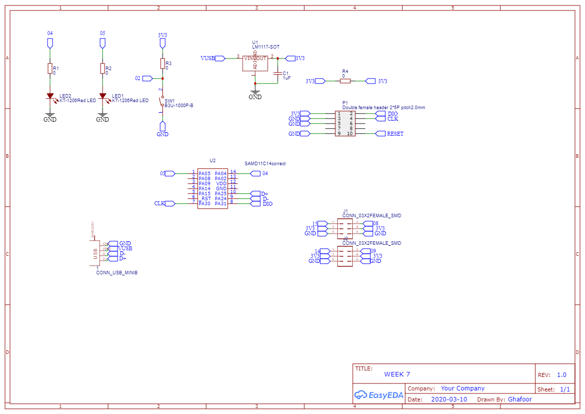 This is my circuit layout that I designed. According to the requirements, I have 2led, 5 resistors, capacitor, ic sam d11 and batten And Bin Hydar 2x3 Bin Hydar 2x5