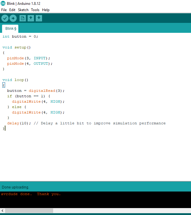 The code is a led and a button and when I press the button, the led works in the circuit that I made and the led that is connected to the breadboard