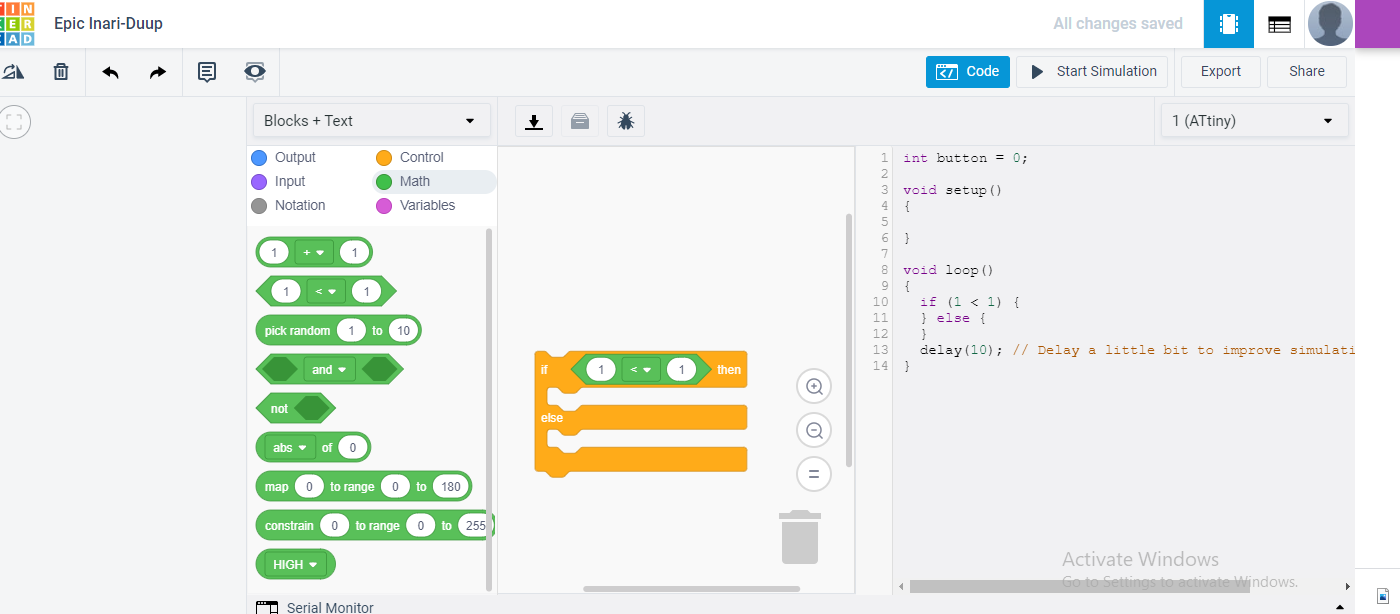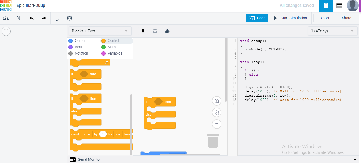 Tinkercad code blocks are visual blocks you can drag-and-drop to create Arduino programs. Using the Tinkercad Circuits simulator, you can test any code you create directly in the browser, before you build and program your devices with real physical components.