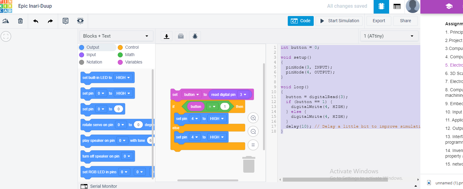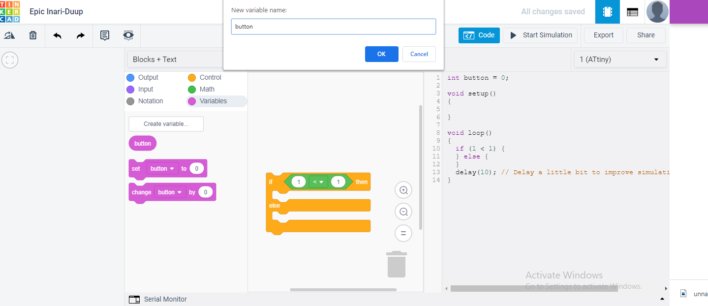 - Then I added the condition that will be compared which is 1 so when the button is HIGH it will produce 1 if 1=1 the action will be performed