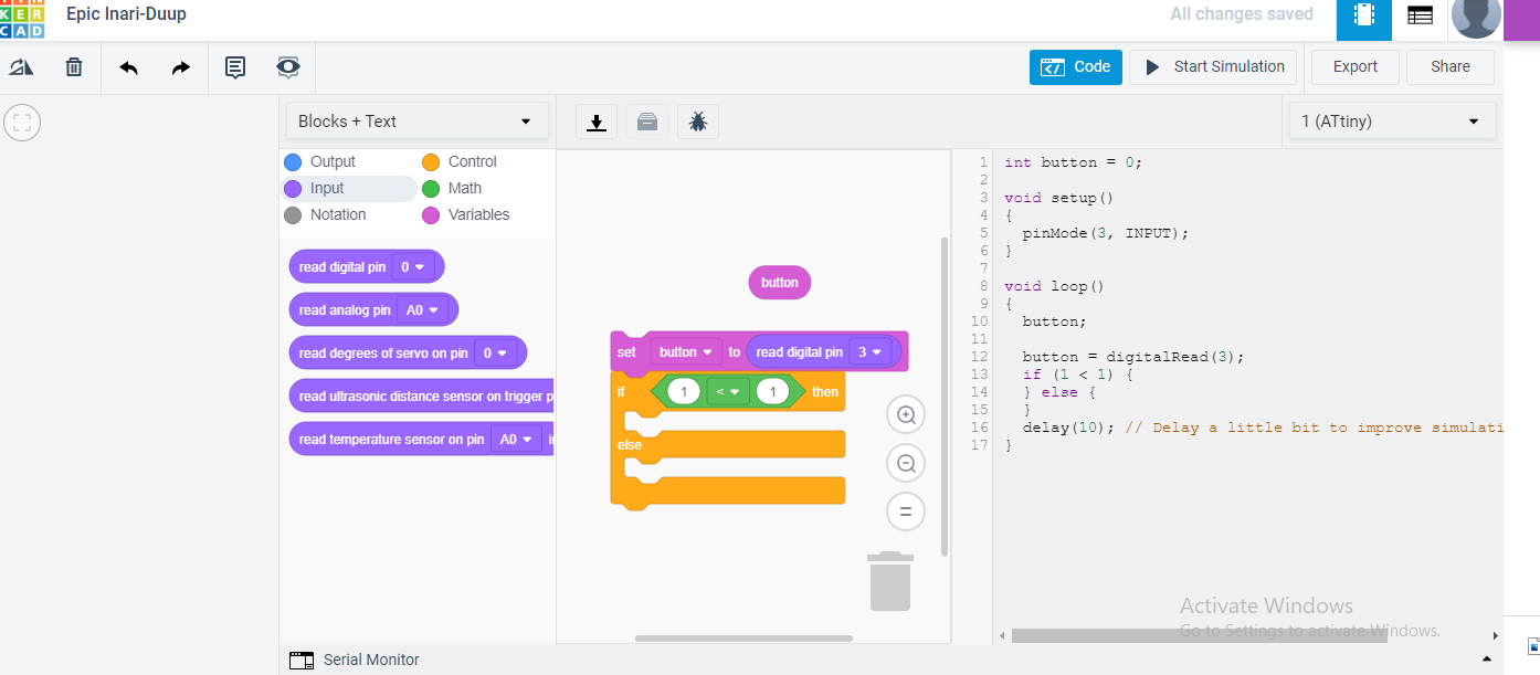 I started with adding if the condition so that the button can send a logic to perform some action which is turning ON an LED
