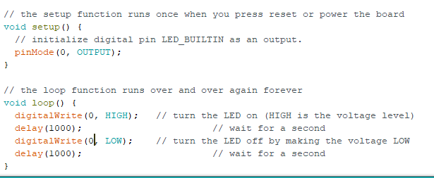 digitalWrite(0, HIGH); // turn the LED on (HIGH is the voltage level)