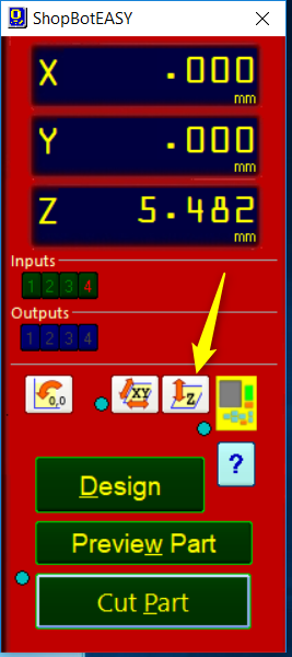 then to test the circuit before running the zeroing routine, touch the plate to the bottom of the bit. Check that input 1 lights up on the screen and goes off as soon as contact is broken. Click on the Z zero button, or type a C2 command. The Z-axis will touch the plate twice and then move up to a safe height. The Z-axis is now calibrated and the machine is ready to cut. Place the Z zero plate back in its holster. Remove the grounding clip from the bit and secure it safely.