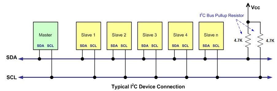 it is one of the most communication ways used , I2C, is a half-duplex hardware protocol that uses two conductors, one clock (SCL) and one data (SDA) line, to connect two or more devices. One device, designated the master, uses the clock signal to synchronize data transfer to one, or multiple, slave devices at speeds up to 400 Kbps.