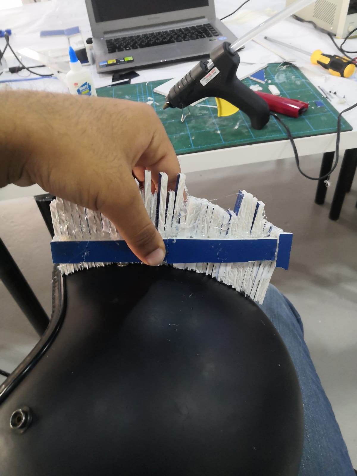 Next I want to know the angle of the helmet, So I start cutting small pieces and glow them in the helmet side by side for same the long of the case, then I glow them together and I added some support
