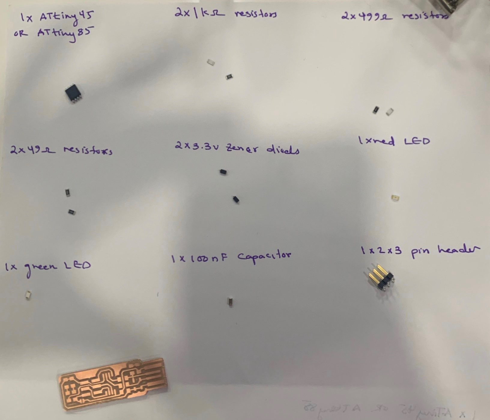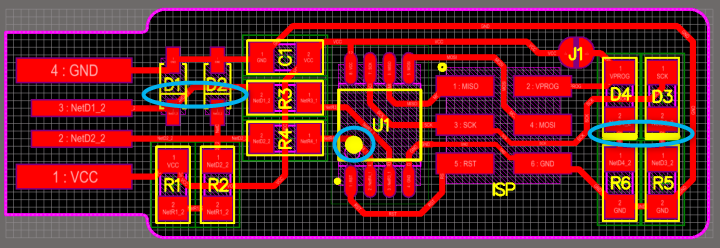 In the soldering process, the direction of the Atiny45, zener diodes and LED, should be observed.