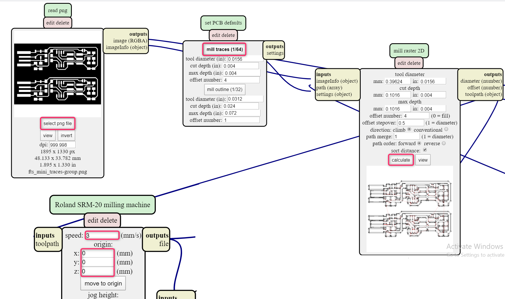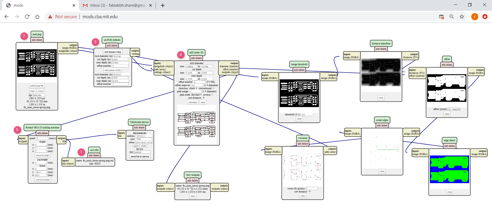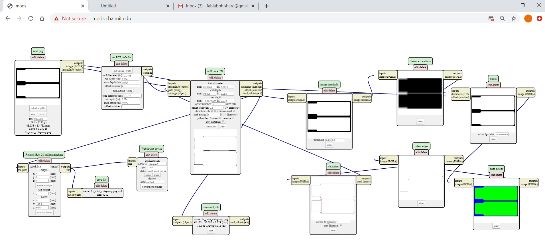 - “Right click” near “Roland SRM-20 milling machine”, “modules” » “open server module”, under “file” choose “save”. Match between the “outputs file” and the “inputs file(object)”.