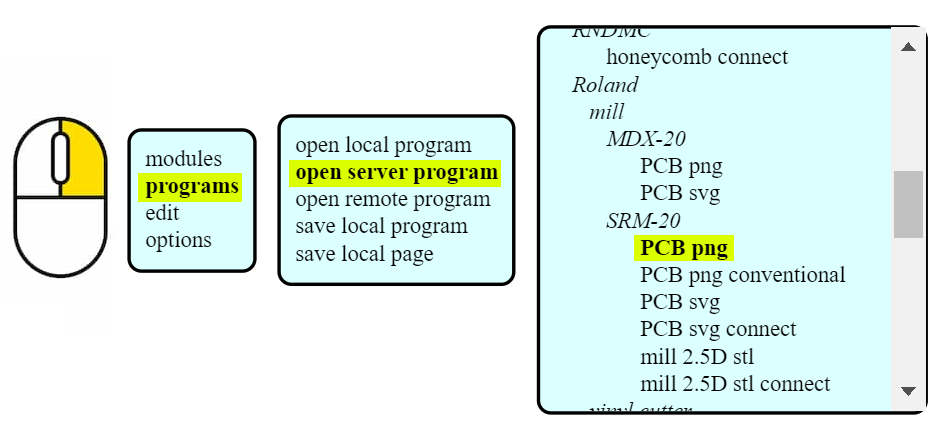 Open this website “http://mods.cba.mit.edu/”, “Right click” >> “program” >> “open server program” >> under “SRM-20” click on “PCB png”, We may also choose to use SVG files.