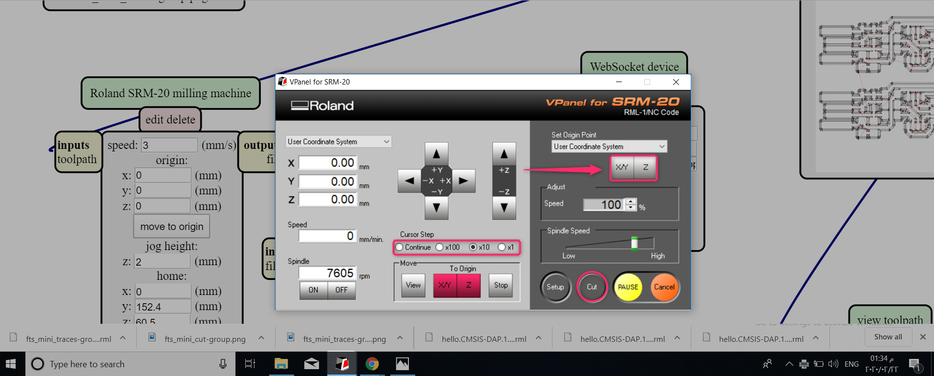 - You can change the milling speed and the origin from “Roland SRM-20 milling machine”. Set the origin to zero, I once did not change the origin and they remained as they are on number “10” and the machine tried to mill on a height from the copper plate.