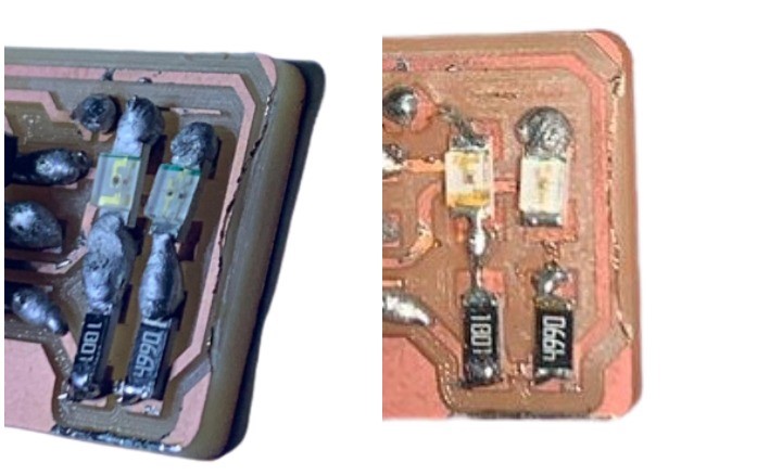 Place the desoldering wick directly on the excess material, then put the solder on it, so the excess material sticks to the wick. This is a picture of before and after using “SUPERWICK”.