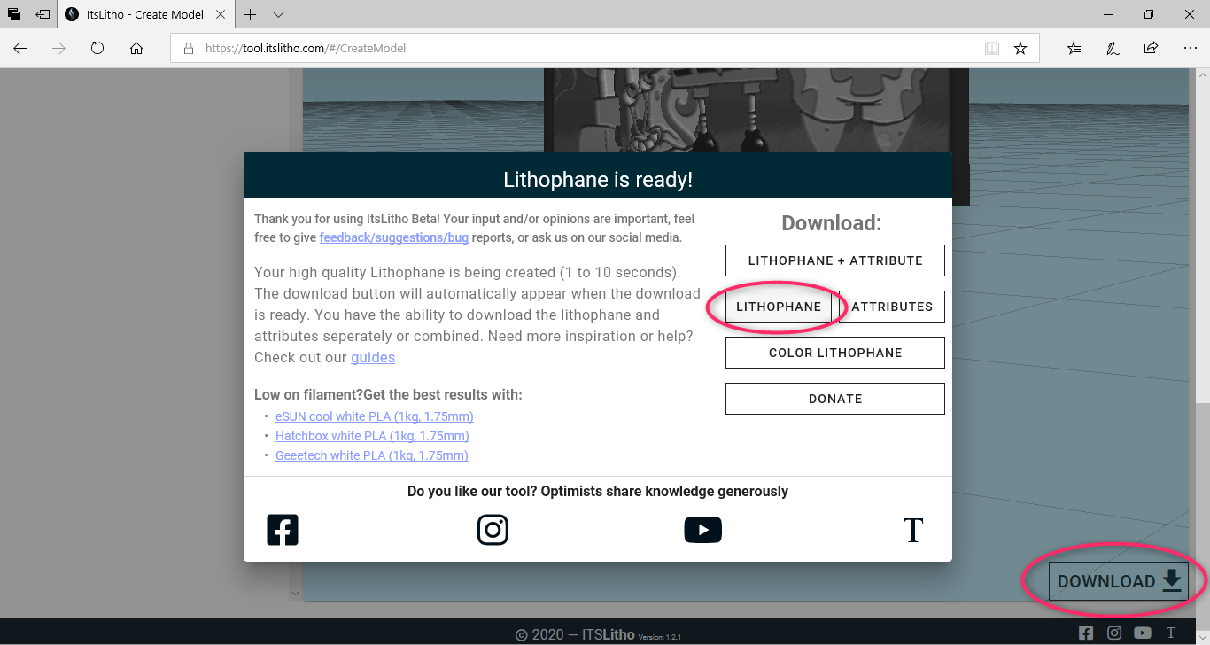 “DOWNLOAD” >> “LITHOPHANE” to open the 3D design in STL format