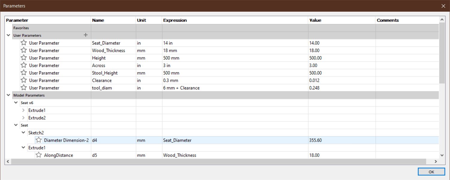 I will use in my design the parameters to be able to change its size whenever I want, so if I change any of these my entire design will update, and because the measurements of the seat parts are connected.
