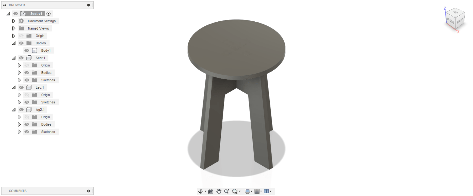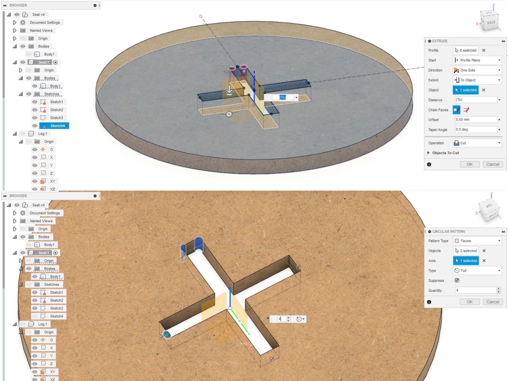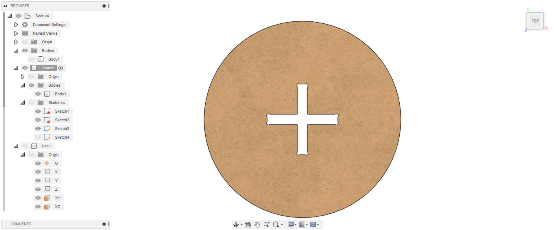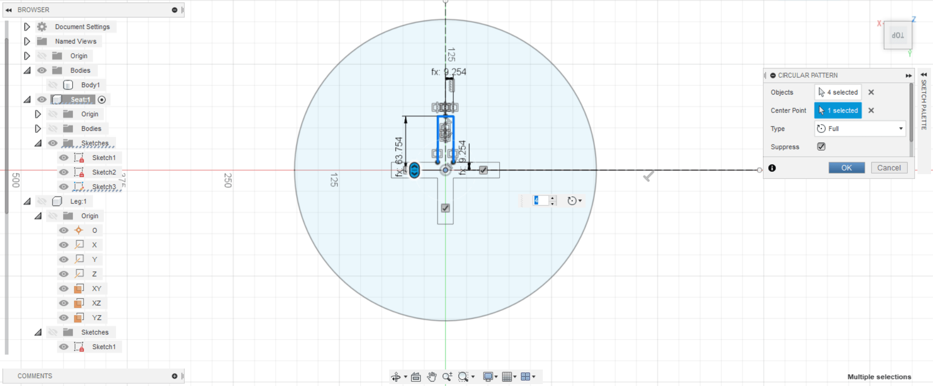 In the center of the seat an opening holding the two legs, a cutout in the seat to all fit together. I will draw one part for one leg, then using this “Circular Pattern” I will repeat it for the rest of the parts.