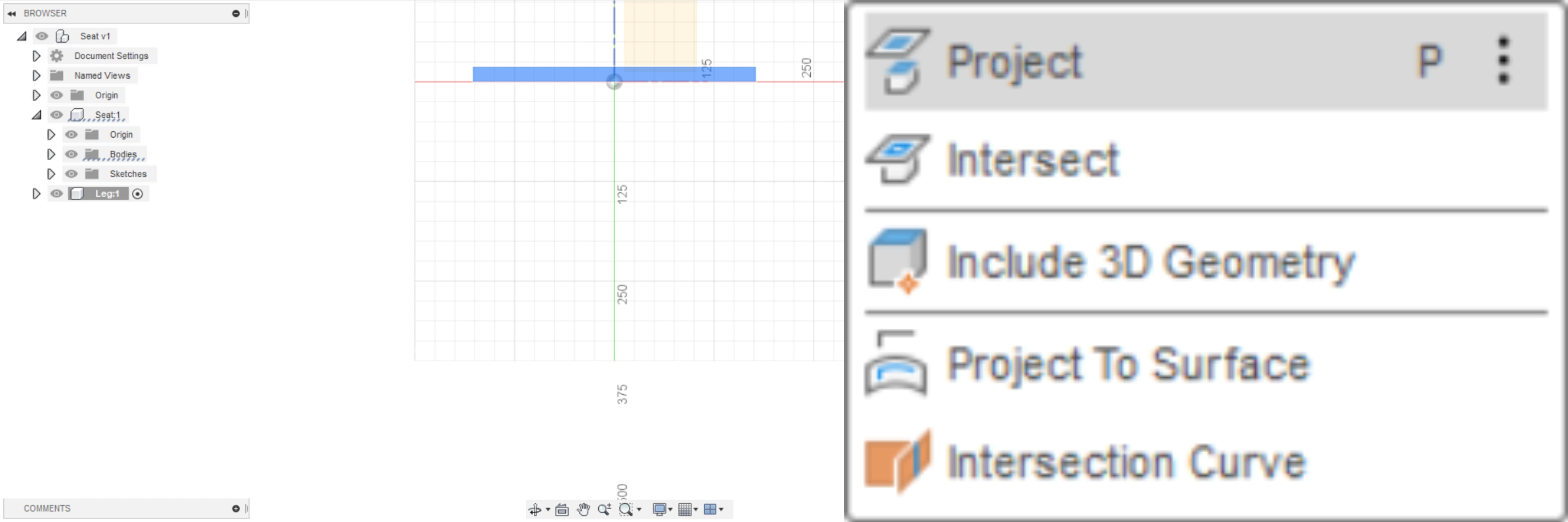 After I finish sketching the part of the seat, I will create a new component for the leg of the chair. To keep interacting with other pieces of geometry, so I will use project feature, to project in some existing geometry.