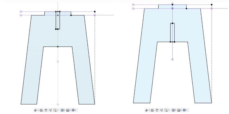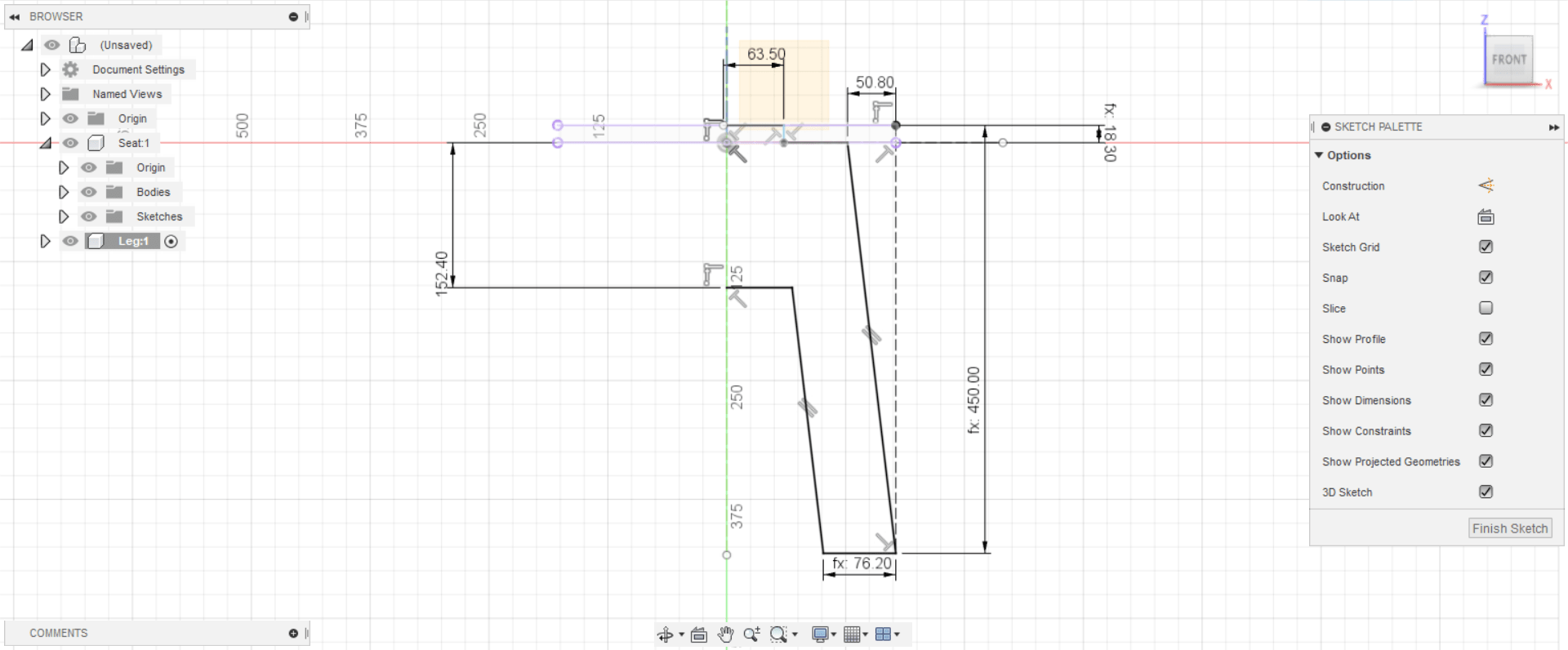 After drawing the legs lines, I set the measurements using the “Dimension” property. What happened is that the sketch has crawled to the left, while I want it to be on the middle line.
