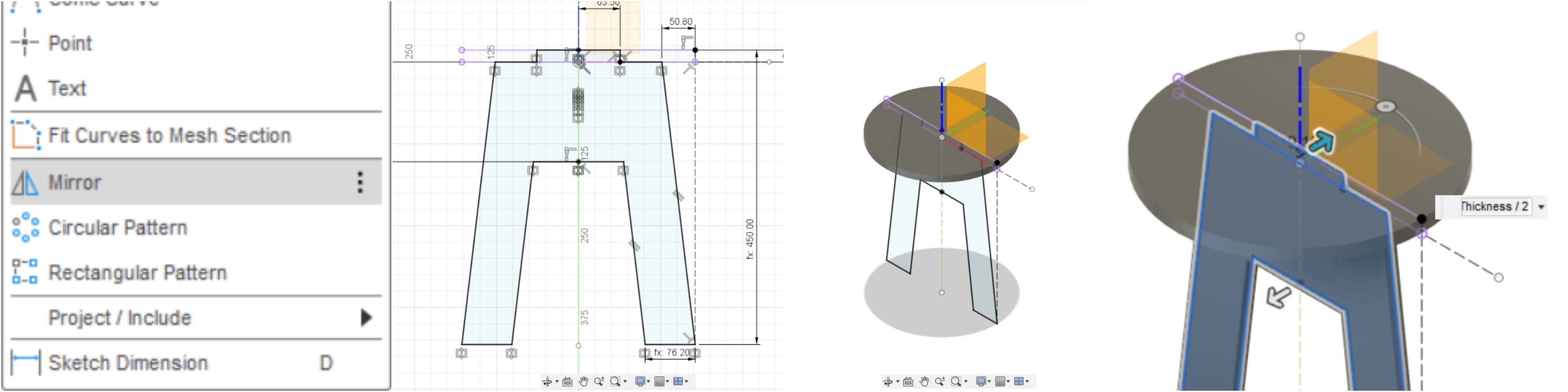 I will choose the mirror feature to show off the second half of this leg. To complete this step I will extrude this sketch. I want the extrude to be in the origin, for that reason I would choose the symmetric direction. Because I want to extrude it with the thickness value, the distance will be equal to the thickness divided by 2.