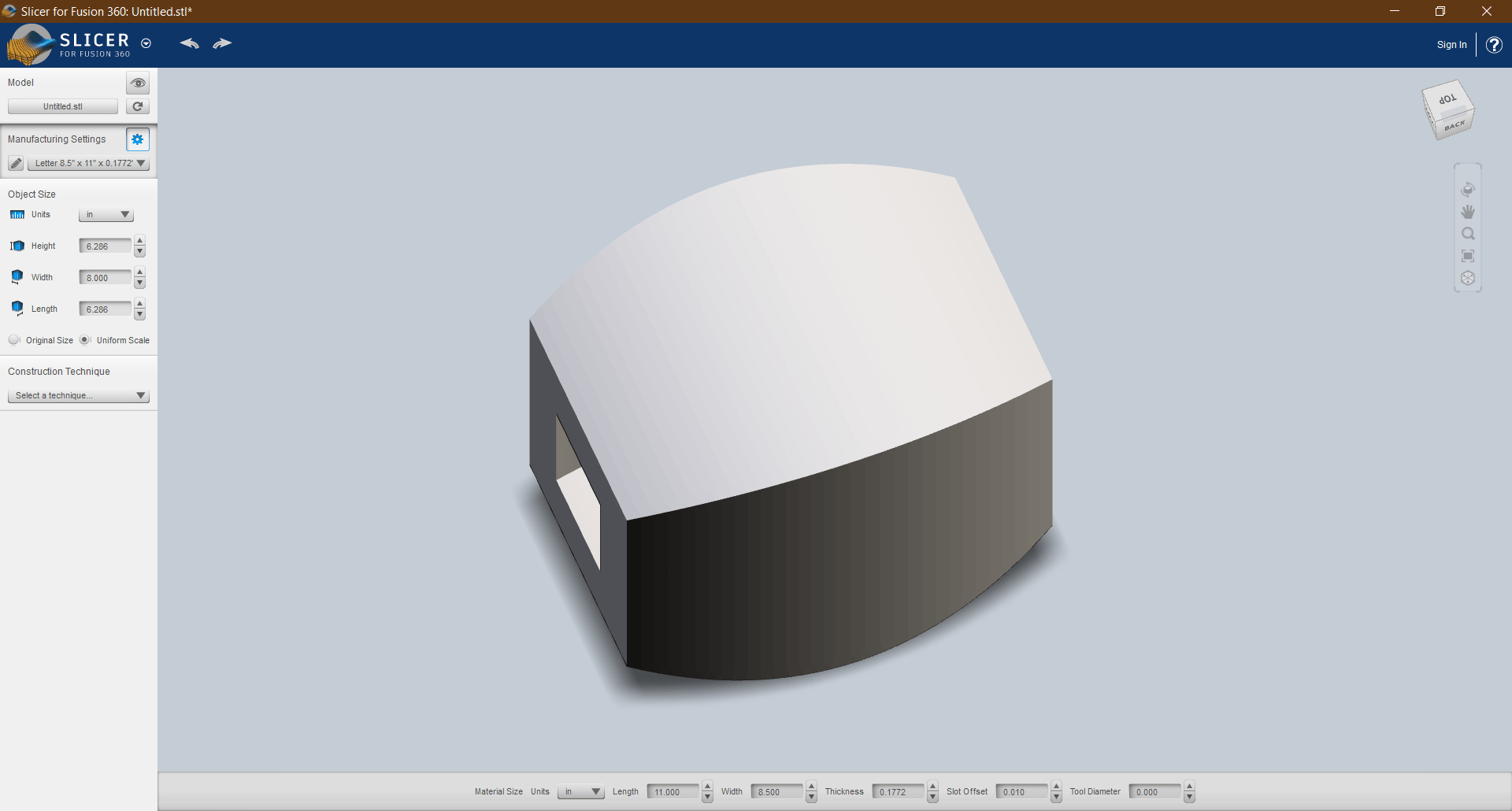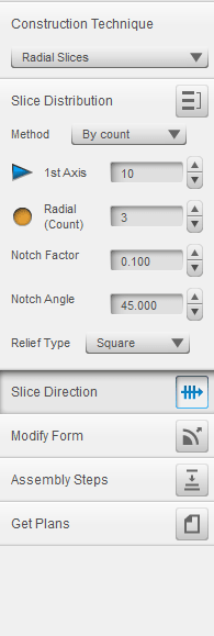 Using the bar on the left of the screen, I can specify the shape of the slice that we want to cut the model with, “Construction Technique”. I chose “Radial Slices”. I can also specify the number of slice I want, “1st Axis” and “Redial (Count)”.