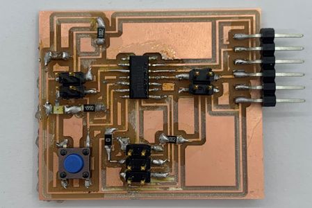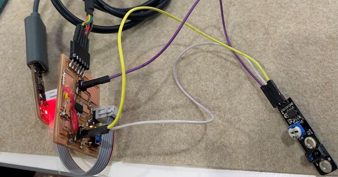 For this input devices assignment, I need to connect three headers for the sensor, GND, and VCC, as well as a digital pin which I choose to connected to the ADC pin “11” of the ATtiny44, which is “2” in Arduino.