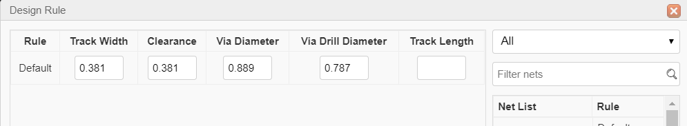 Before start routing the traces, don’t forget to set the appropriate “Design rules”, and also to check the “DRC Errors”.