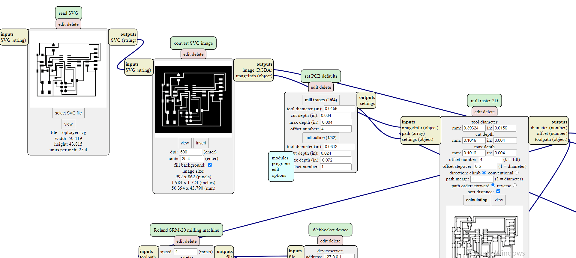 Once I had the traces all laid out, I exported them as “.svg” files to start milling, as the “Top layer”, “Holes”, “Outlines” each in a file. That is to prepare for milling.