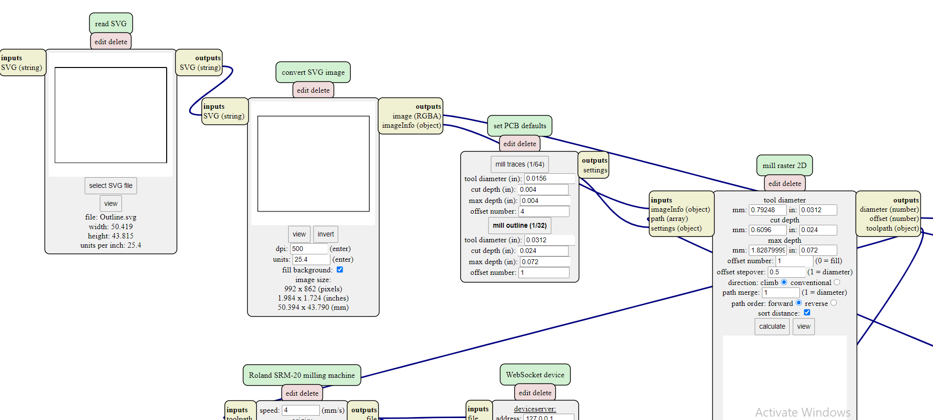 I saved the PCB file as a “.svg” file to open it in MODS, so I could send the job to “VPanel for SRM-20” to start milling. I refer to Electronics production week to recall the steps.