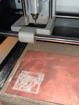 This is a picture after finished milling the top layer, and changing the milling tool from “1/64” to “1/32”.