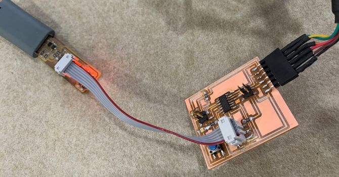I connected the board ISP header to the FabISP, and connected the board to the FTDI cable to get power.
