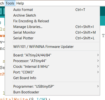 I will use Arduino IDE for programming, and this is my board tools settings. The ATtiny44 has an internal clock that runs at 8 MHz, and I used the “USBtinyISP” to program it.