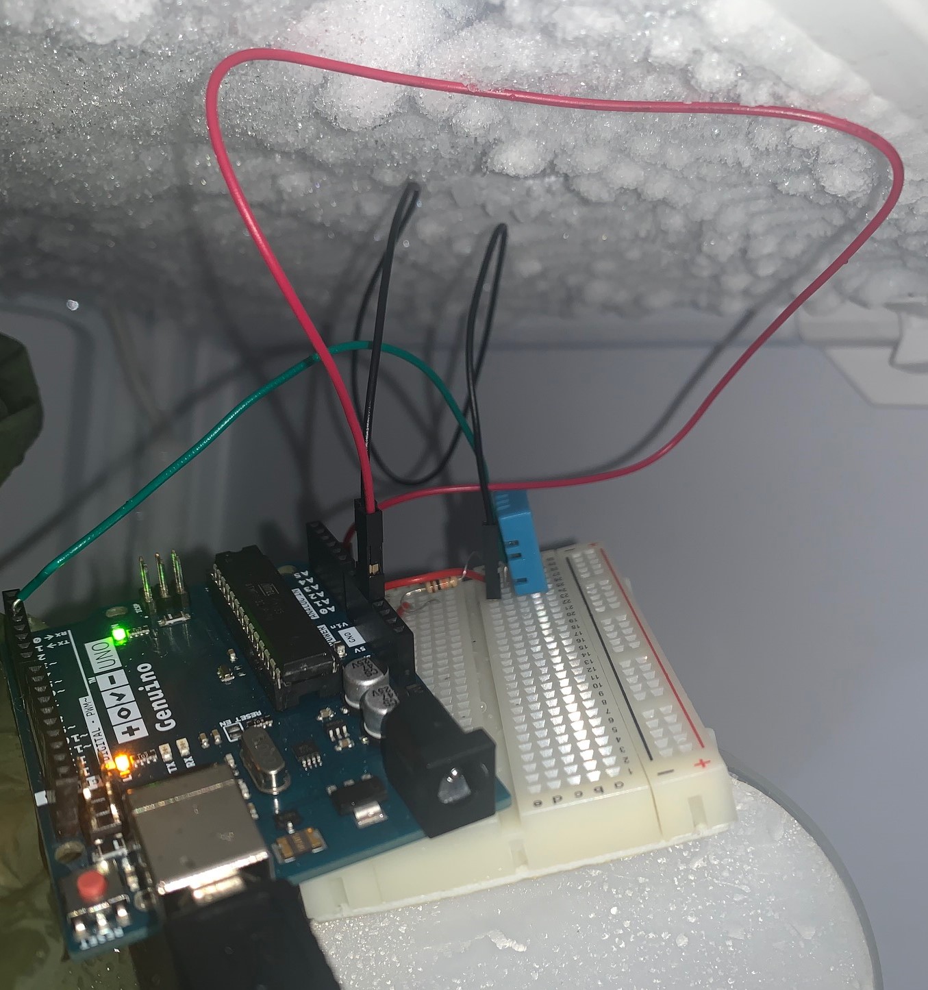 I put the sensor in the freezer because I think it is an ideal place to test the sensor reading for temperature and humidity together. Humidity is the presence of water vapor in the air (or any other gas). In normal room air, there is typically about 1% water vapor.