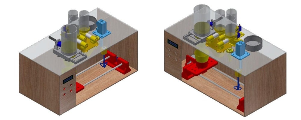 This is a picture of the machine design, and these are separate videos from making the coffee machine. This design shows that we have carefully designed every part of the machine, from ingredient containers, cup holder and base, flowing of water, and the mixture.