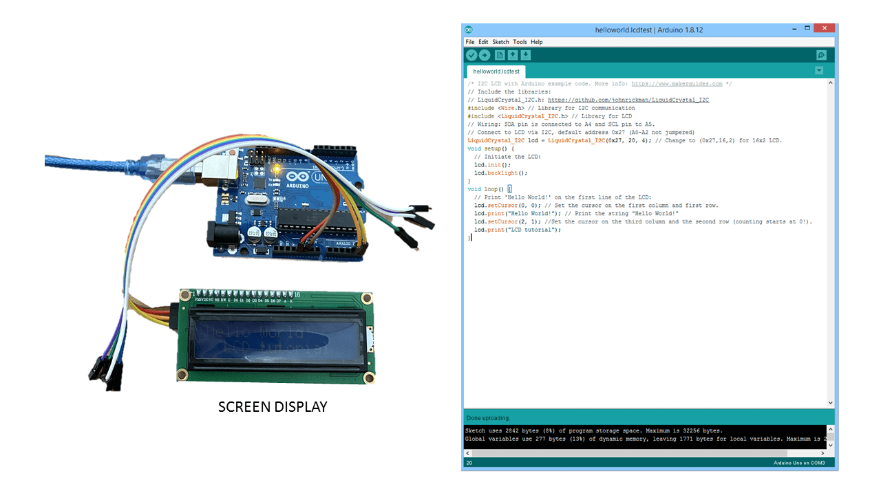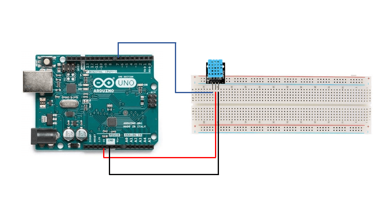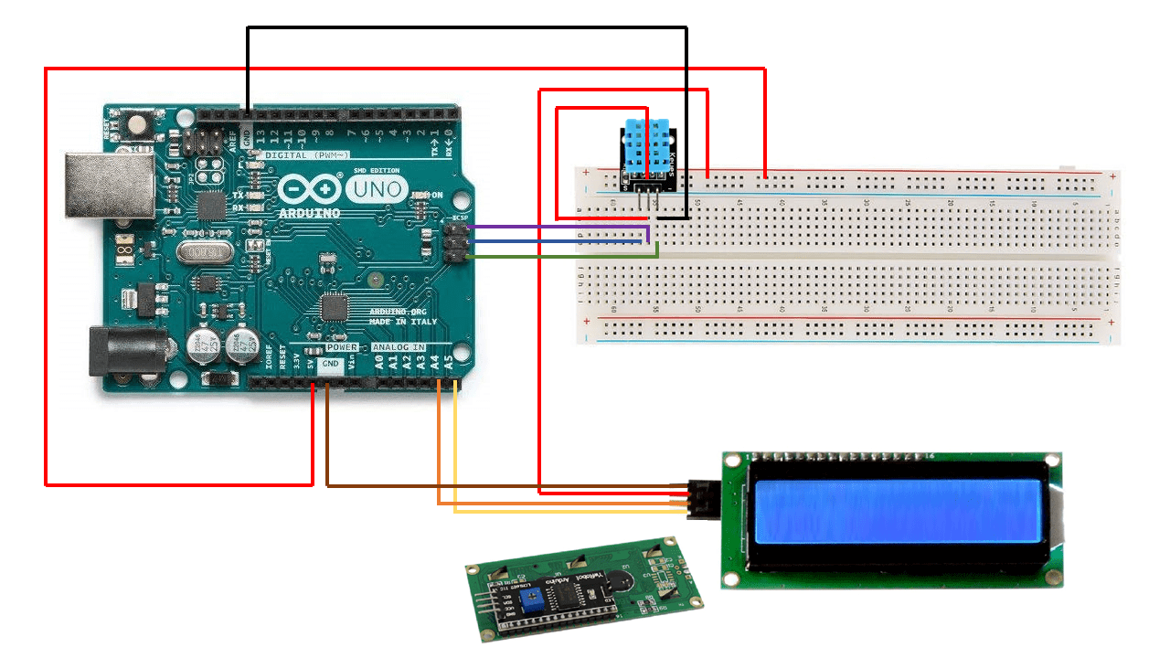 So what I did was using the breadboard, to connect the dht11 and the LCD to the Arduino.